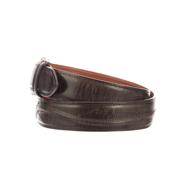 Lucchese men’s belt made with burnished goat leather. Lucchese craftsmen use a unique polish method that create different hues and add texture to the leather, giving it a vintage look. The belt’s design features subtle Western elements with its seville stitching and silver plated buckle– perfect for jeans or a suit. Handmade in Texas. 1.5″ wide Seville stitching Removable buckle