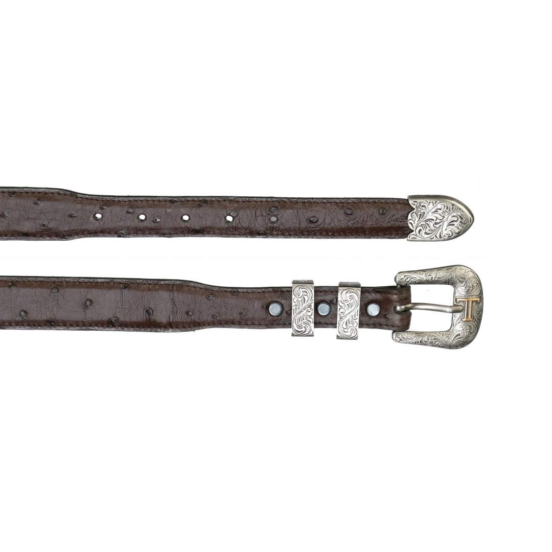 Lucchese’s exotic belt made with full quill ostrich leather. The belt’s full quill ostrich leather is complemented by an ornate silver plated buckle giving it the ultimate Western touch, making it versatile, handsome, and stylish. This belt was designed to be worn with matching full quill ostrich boots, but can also be paired with jeans or a suit. Handmade in Texas. 1.25″ tapered down to 1″ Silver plated tip Removable buckle