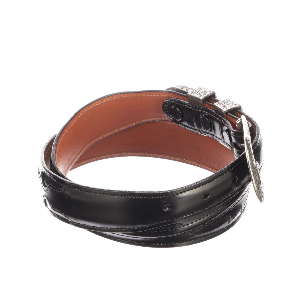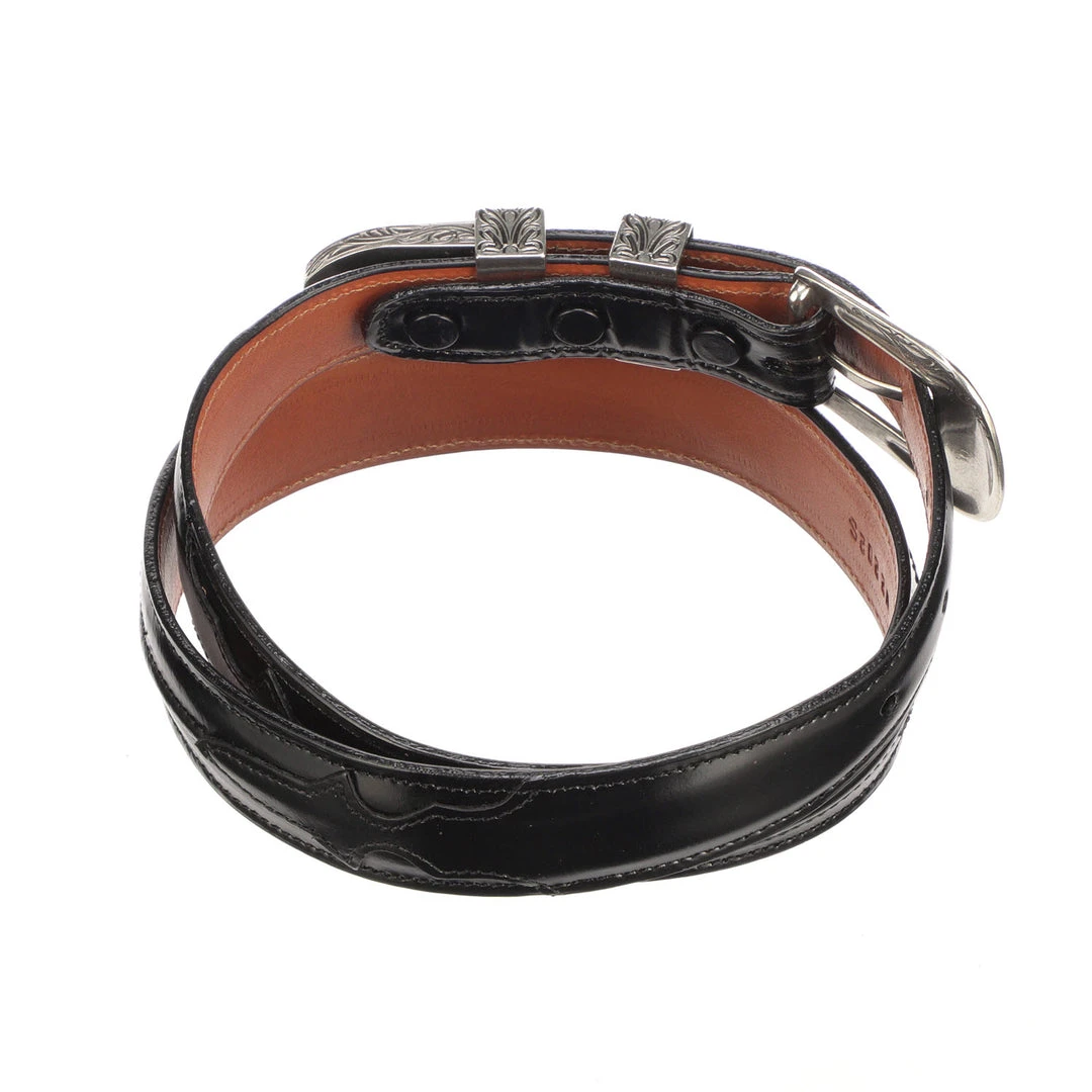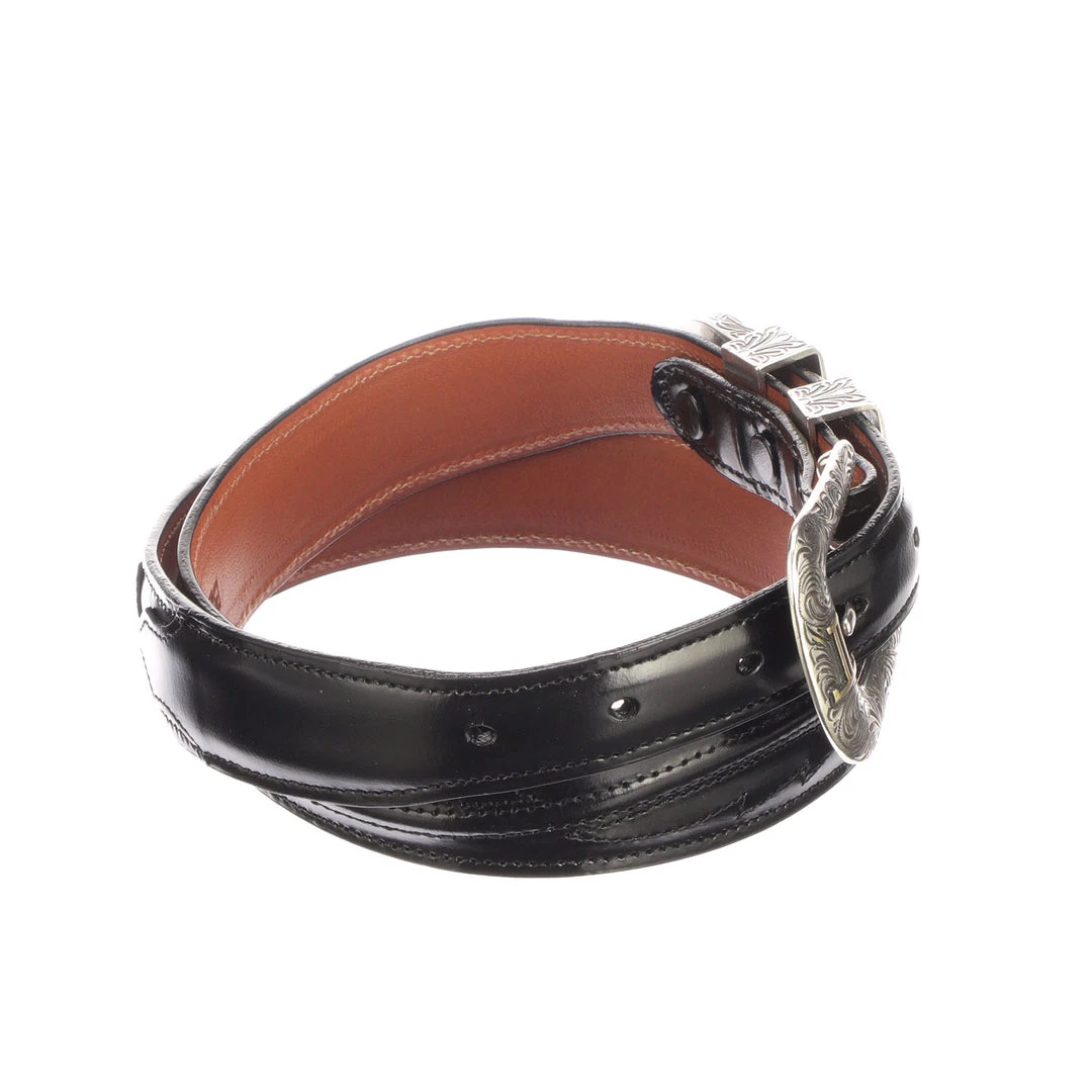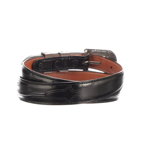 Lucchese men’s belt made with goat leather. With its silver plated buckle and seville stitching, the belt can be paired with a suit or jeans. Handmade in Texas.