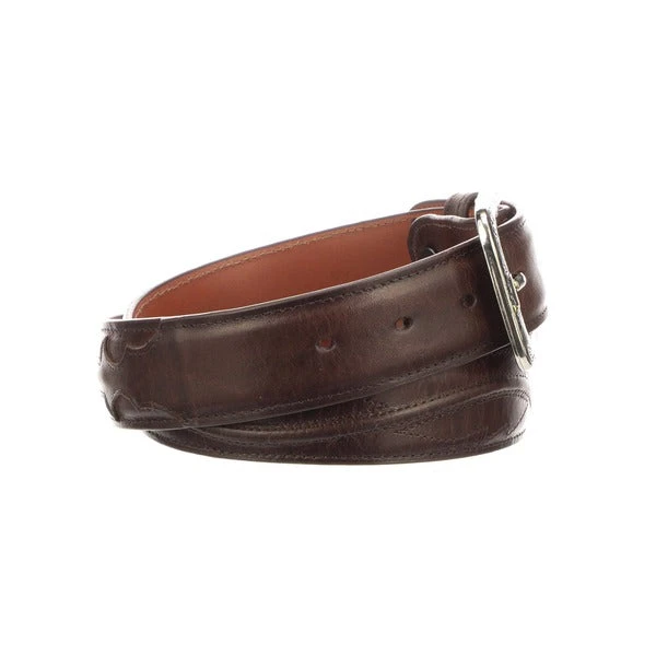 Lucchese men’s belt made with cowhide leather. Lucchese craftsmen use a unique polish method that create different hues and add texture to the leather, giving it a vintage look. The belt features seville stitching and a silver plated buckle with Western details. Handmade in Texas. 1.5″ wide Seville stitching Removable buckle
