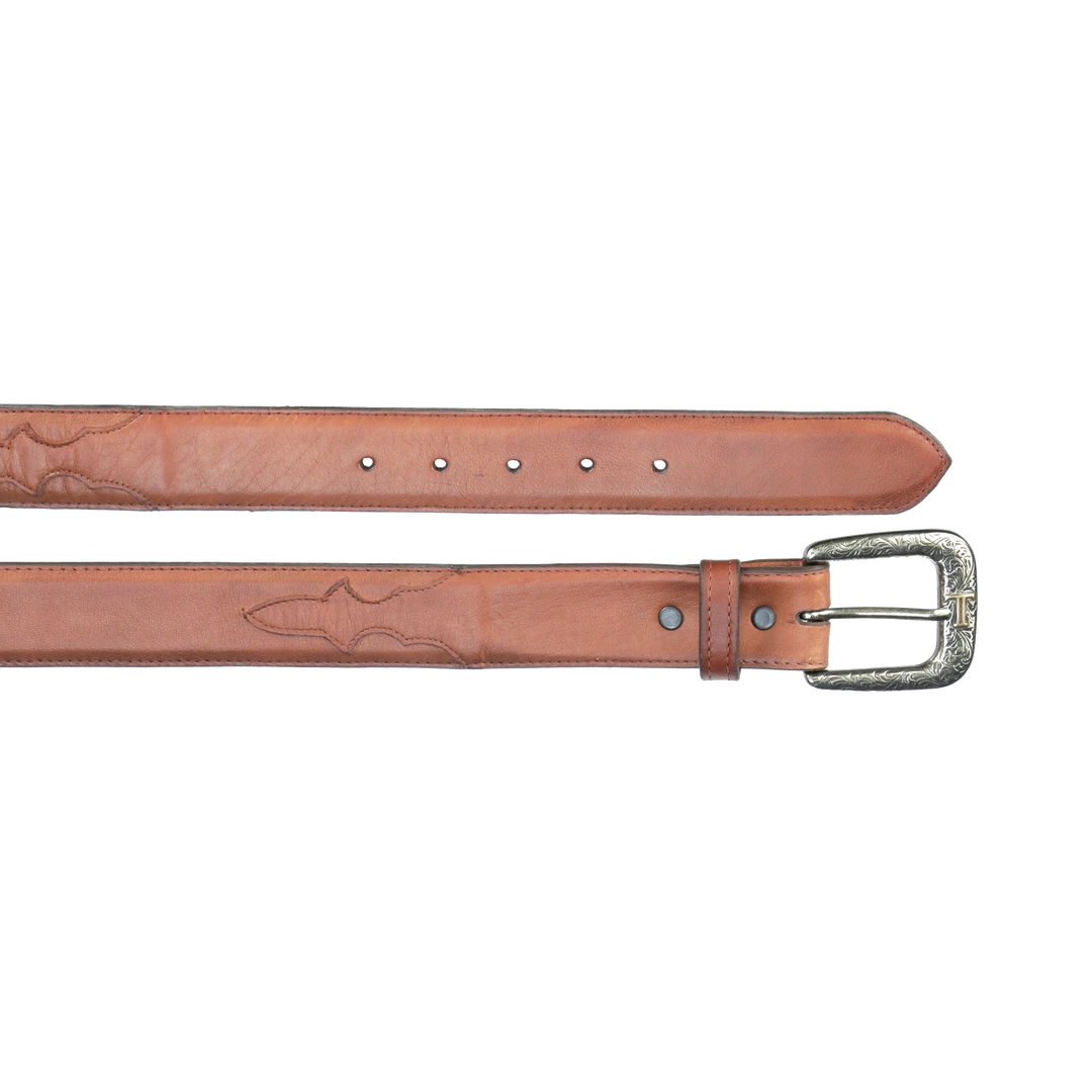 Lucchese menβs belt made with baby buffalo leather. Lucchese craftsmen use a unique polish method that create different hues and add texture to the leather, giving it a vintage look. Made with buffalo leather, this belt is thick and has good durability. Its Southwest buckle add style and versatility to this classic men’s belt. Handmade in Texas. 1.5″ wide Removable buckle