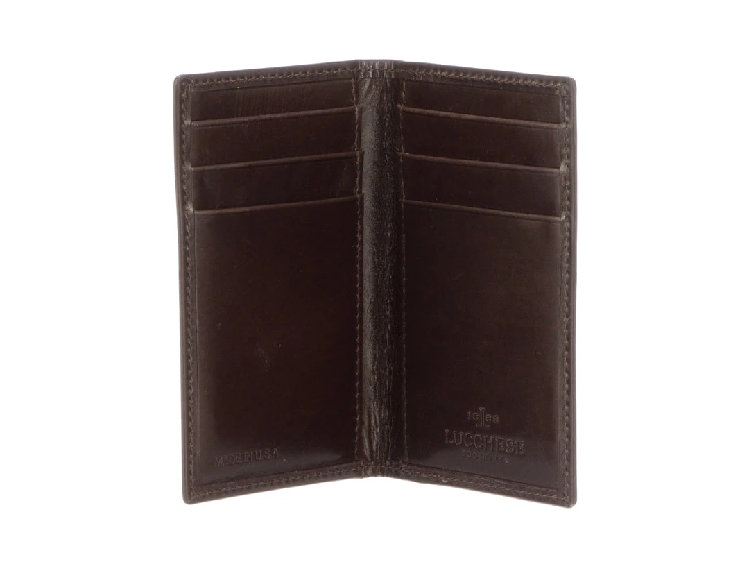 Handcrafted with genuine calfskin leather, the Vertical Bifold provides just the right amount of space for your everyday essentials. This slim design includes six card slots and two slip pockets for additional currency storage. A Lucchese stamped logo on the interior allows for a classic and clean exterior finish. Additional Features: Six card slots Two interior slip pockets Handmade in USA 3″ W x 4.75″ H x .5″ D