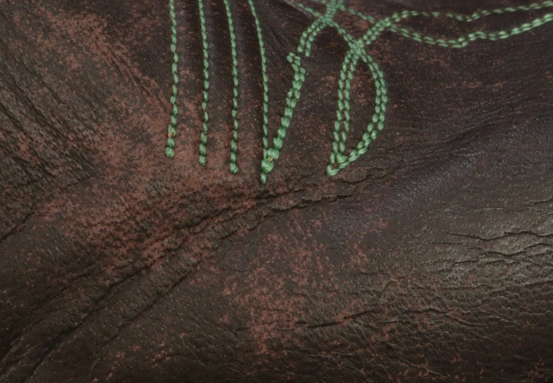 Camilla is a western boot with an edge. The delicate stitch pattern is dotted with studs and constrasted in hue with the color-rich vamp. Single stitch welt construction. Leather sole. Handmade in Texas.